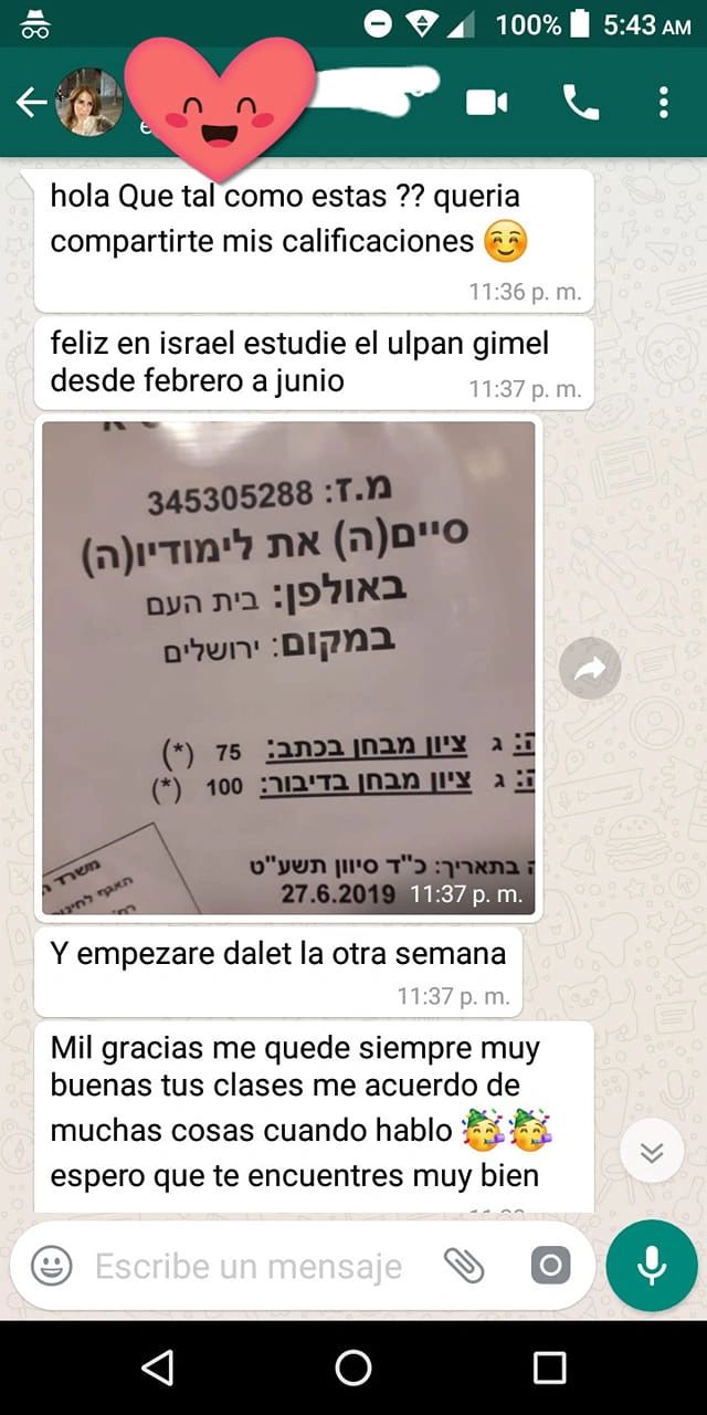 "Estoy emocionado de compartir los increíbles logros de mis estudiantes. ¡Miren las destacadas calificaciones de Ruth en Israel! 🌟 Su dedicación y esfuerzo son inspiradores. Agradezco la oportunidad de ser parte de su viaje de aprendizaje en hebreo. ¡Felicidades Ruth!
